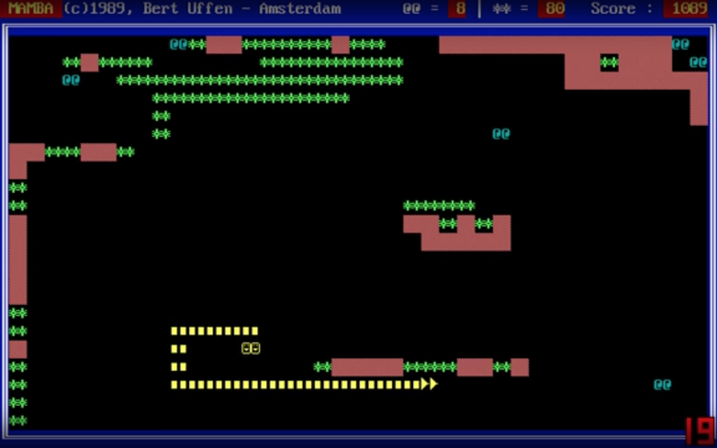 MambaWie kent het spelletje Mamba nog? Dat spelletje dat je vroeger, nog voordat Windows bestond, in Dos speelde? Uren speelde ik het, het geblieb zit in mijn geheugen gegrift, kramp in mijn vingers komt weer naar boven, maar wat was het heerlijk eenvoudig en verslavend. Het past in het rijtje, Sokoban, Commander Keen, 20 varianten van Tetris, maar vooral ook die tijd van de floppies, zwart commandline schermen en aan je opa vragen hoe iets ook alweer werkte. En sinds kort speelt Mamba weer een rolletje in mijn leven.